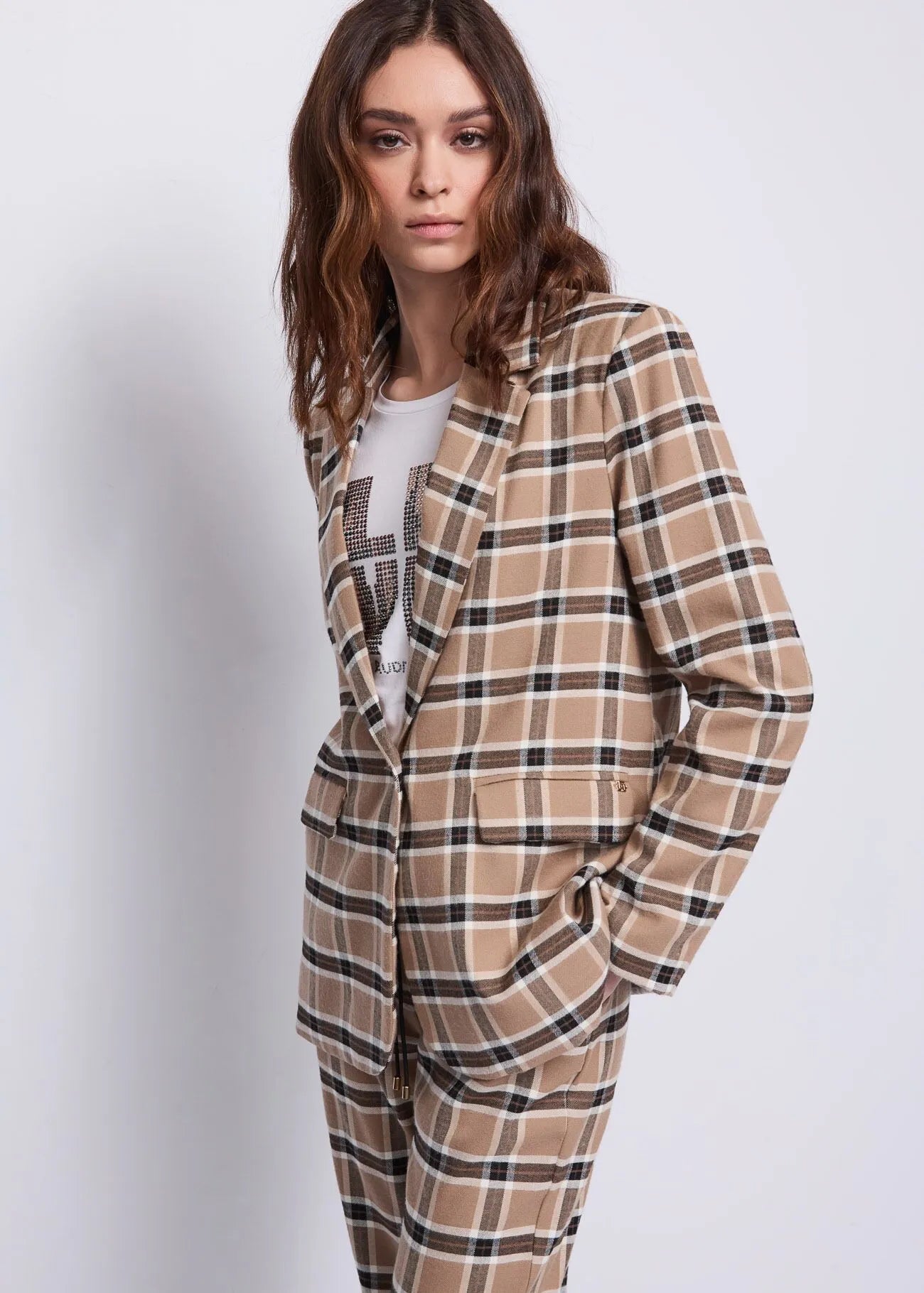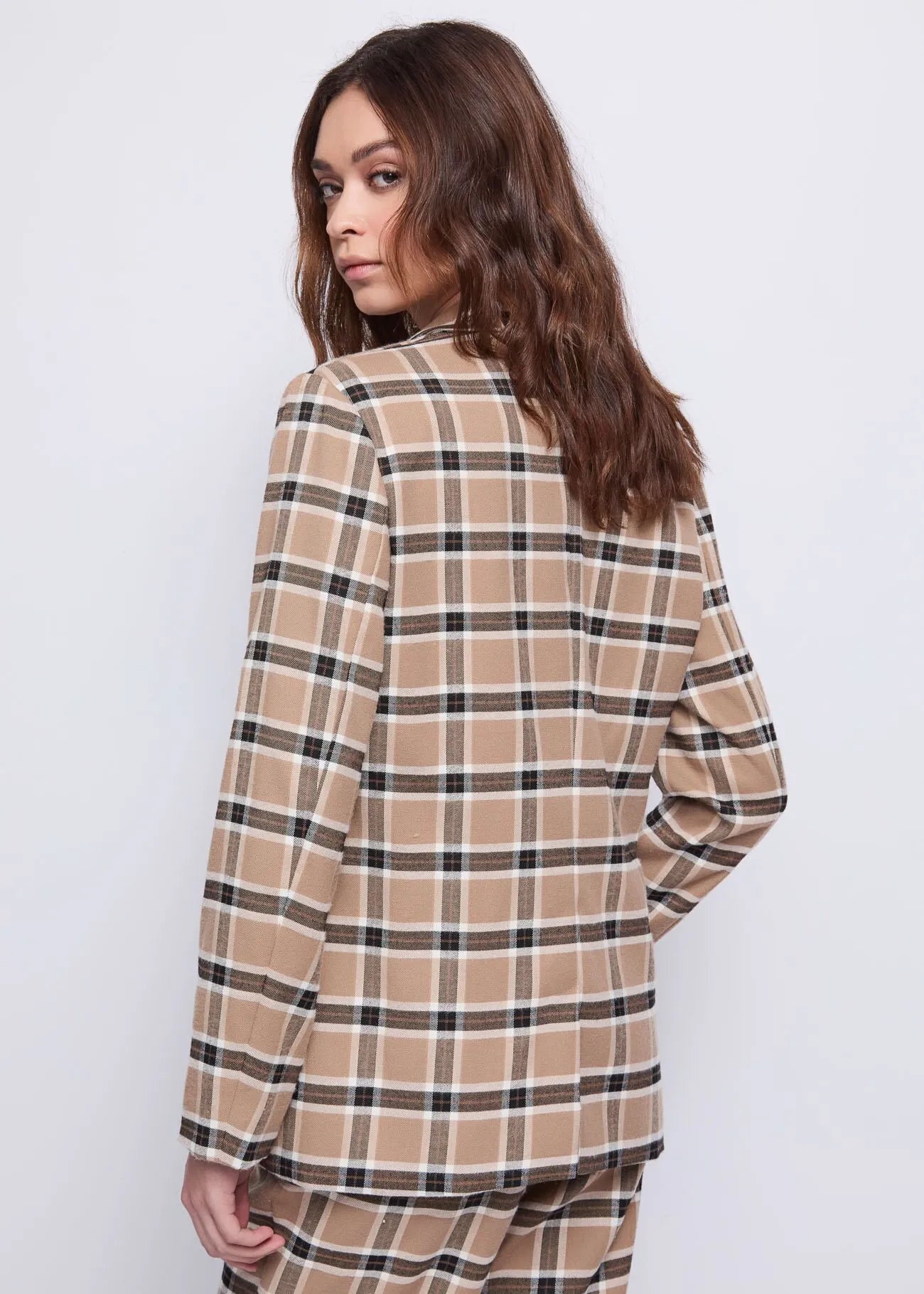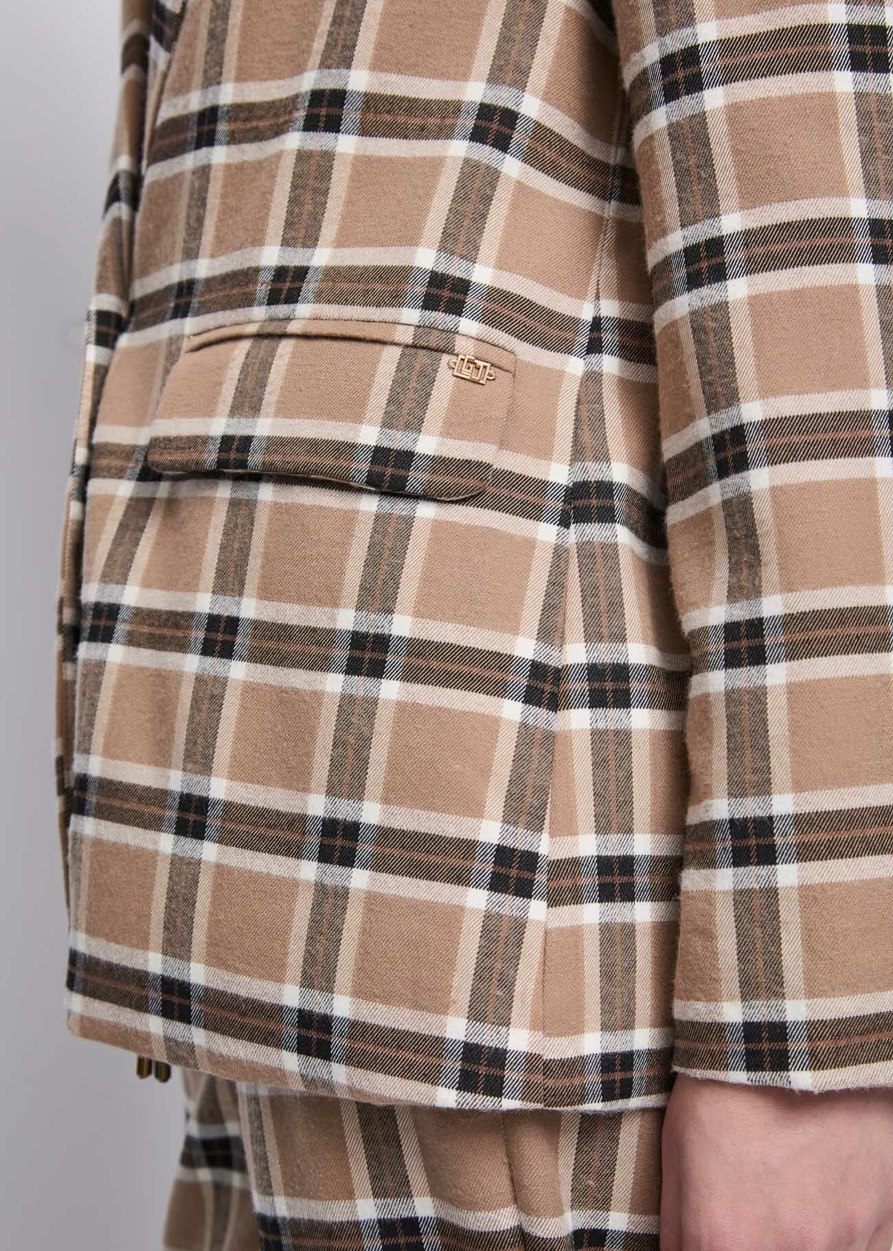 Choose the stretch fabric blazer with an all-over check pattern, notched lapels, and flap pockets. For a contemporary and sophisticated look.
