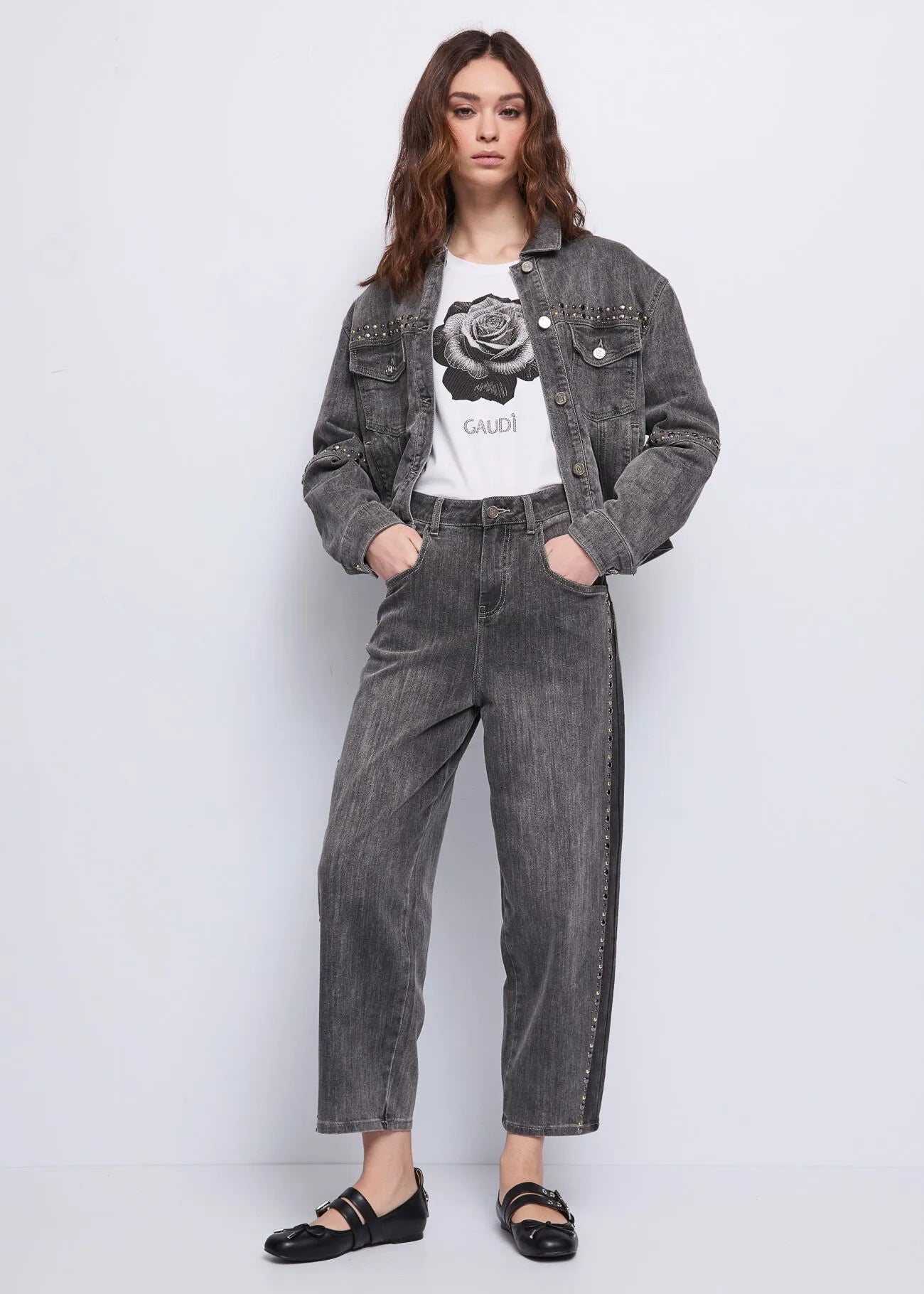 Create an urban rock look by pairing them with the matching jacket and printed, rhinestone T-shirt. For a sophisticated touch, add the strappy, studded ballet flats.