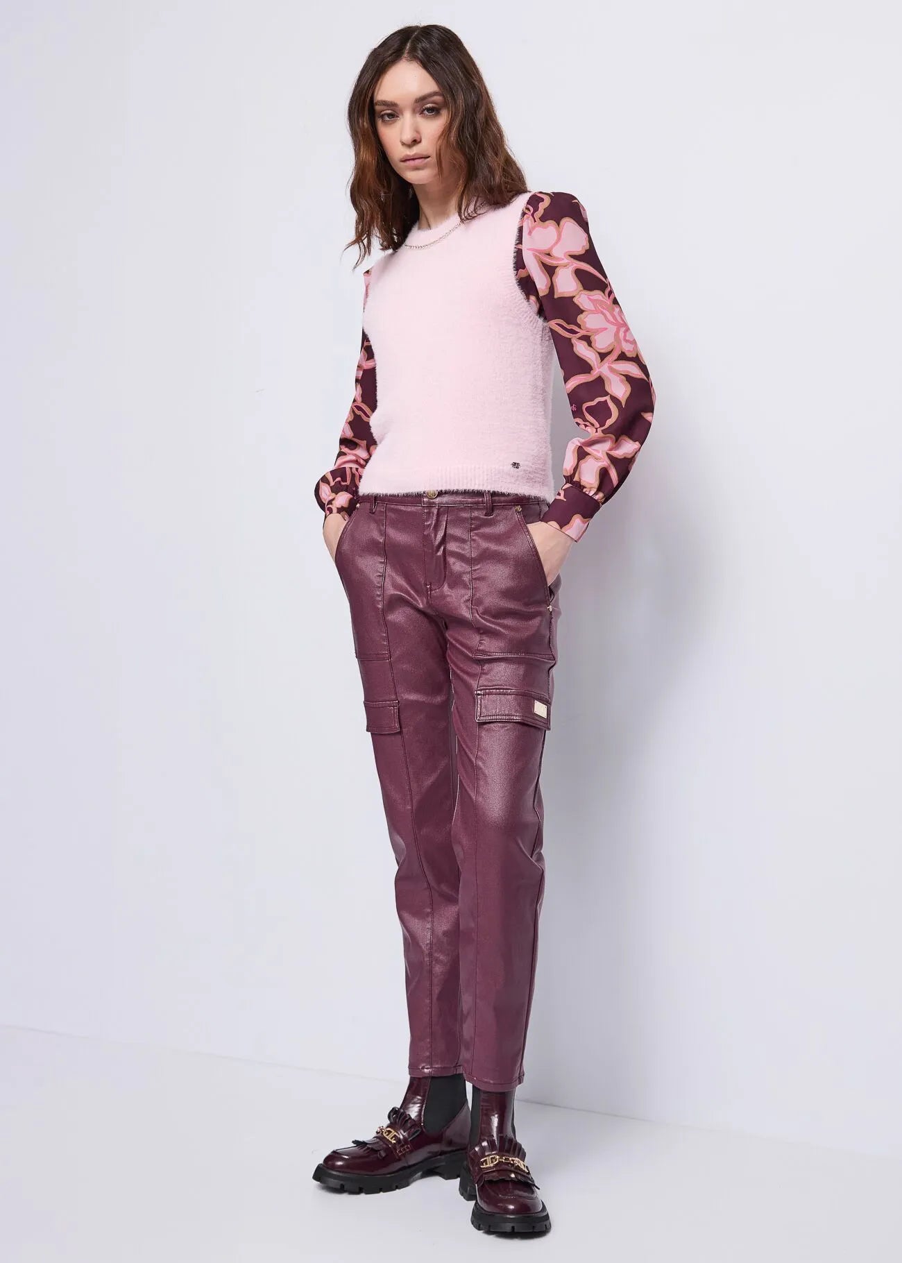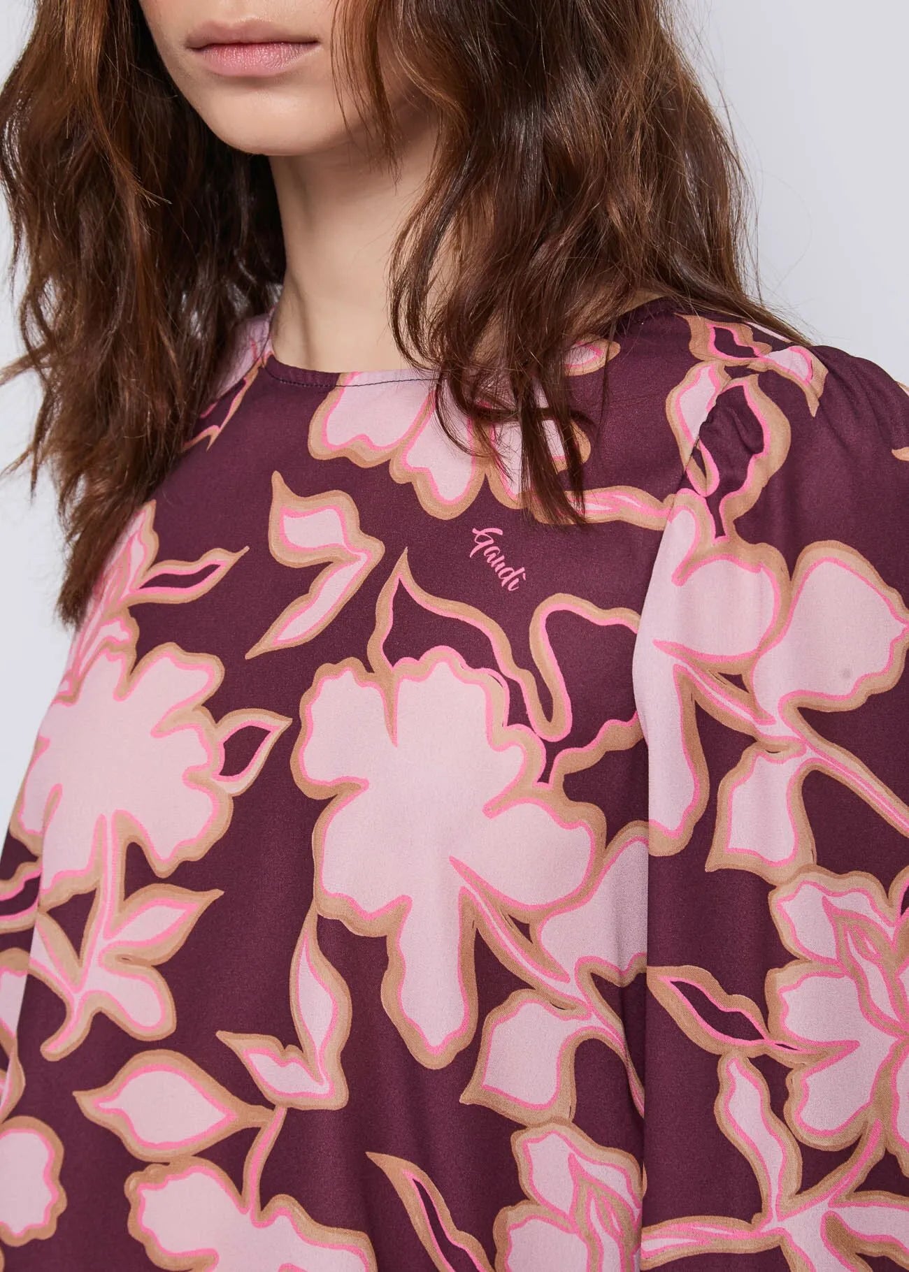 Choose the floral-print tulle blouse with a crew neck, long sleeves, and side slits. Perfect for bold, feminine looks.