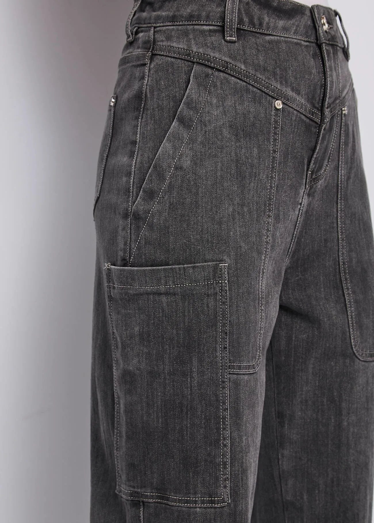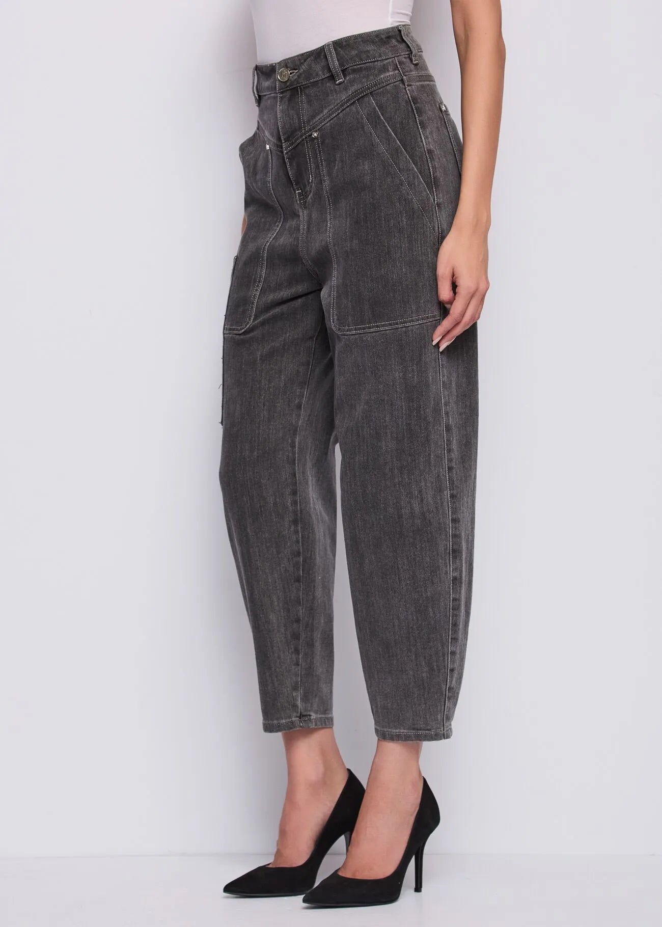 Choose these high-waisted, used-cotton blend cropped jeans with a logo patch. For an urban look with a utility-chic vibe.