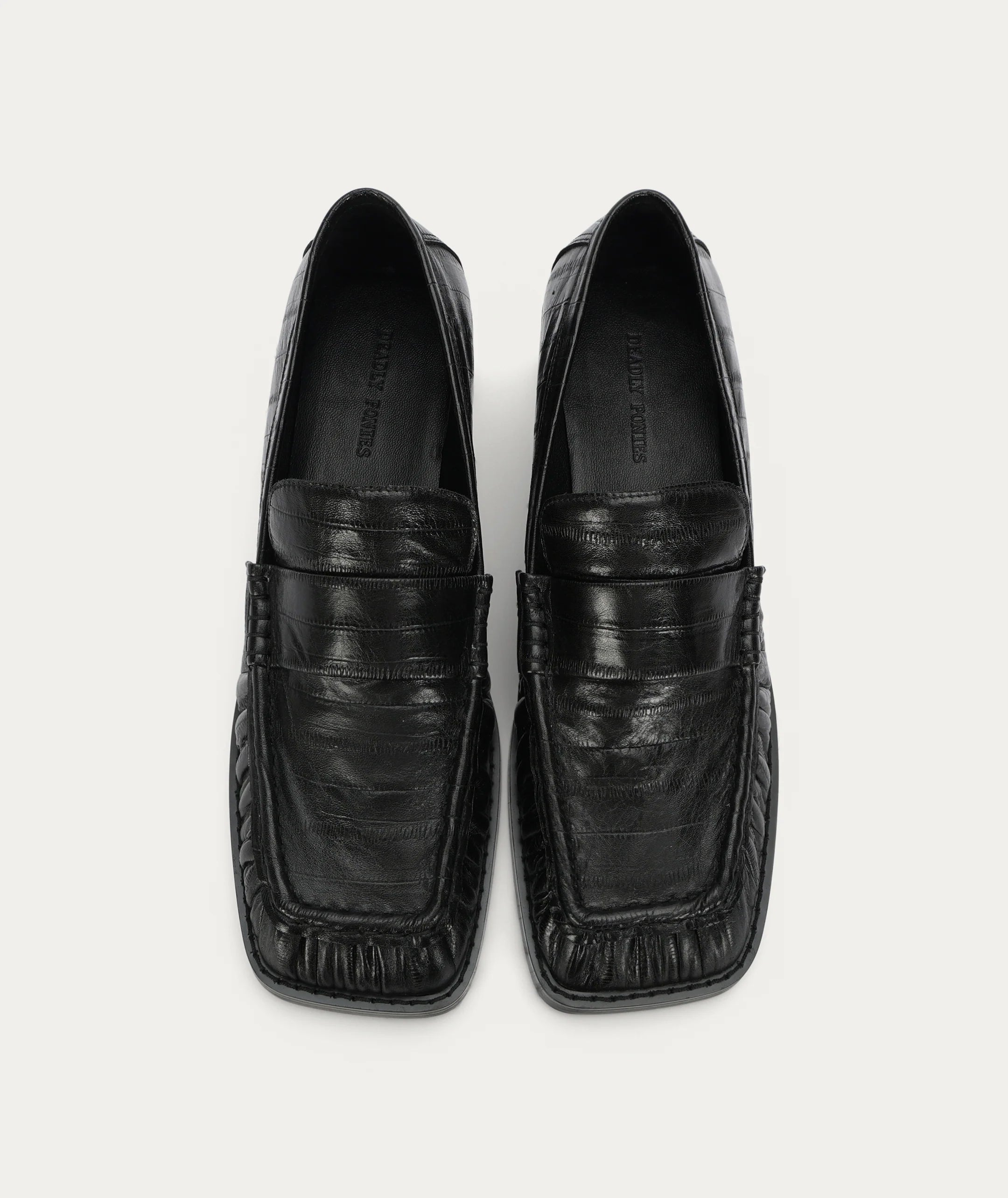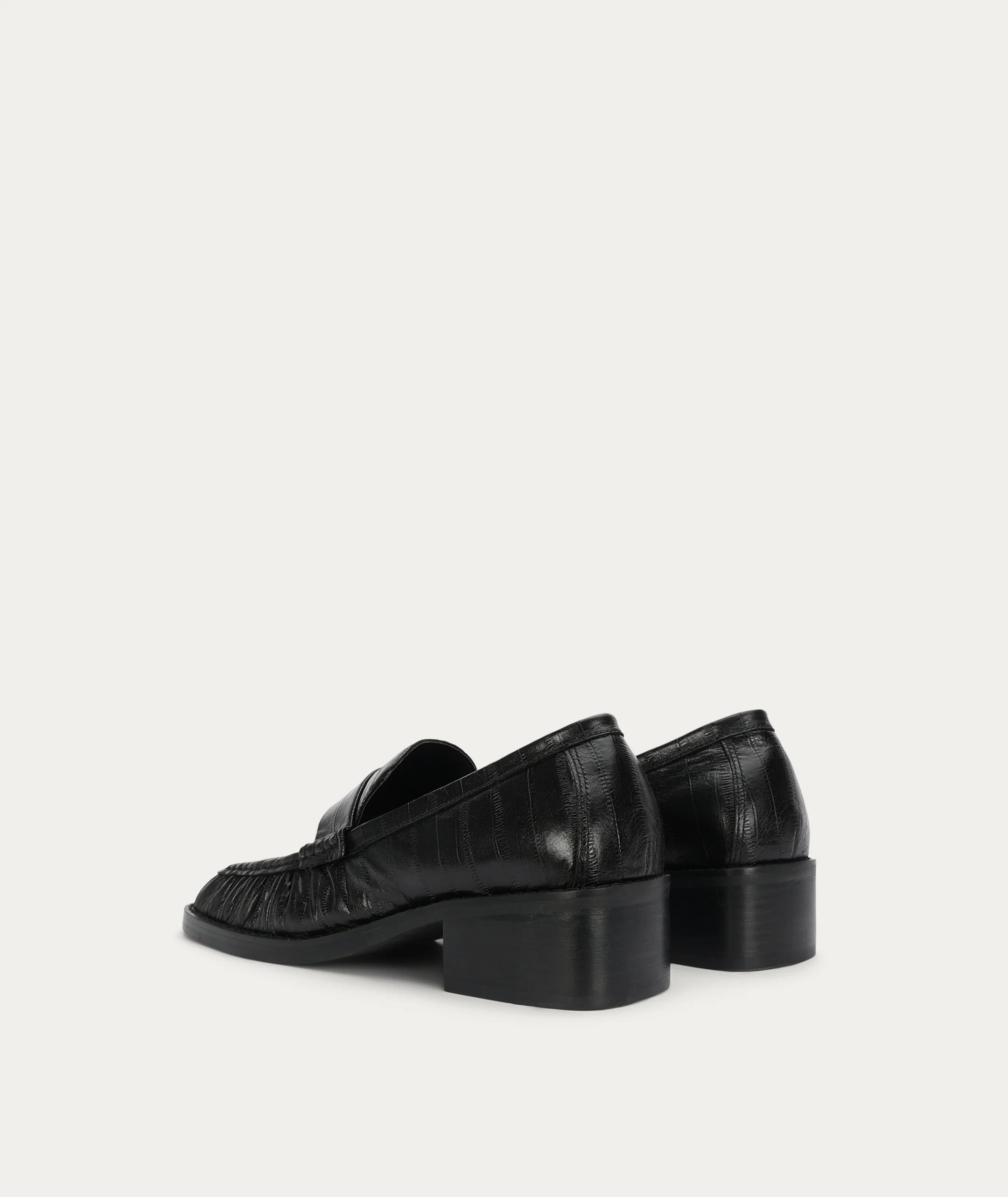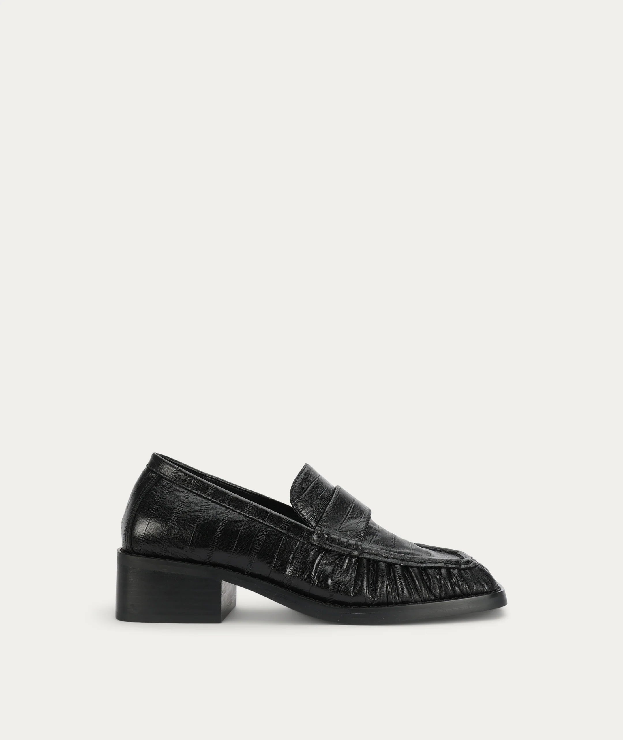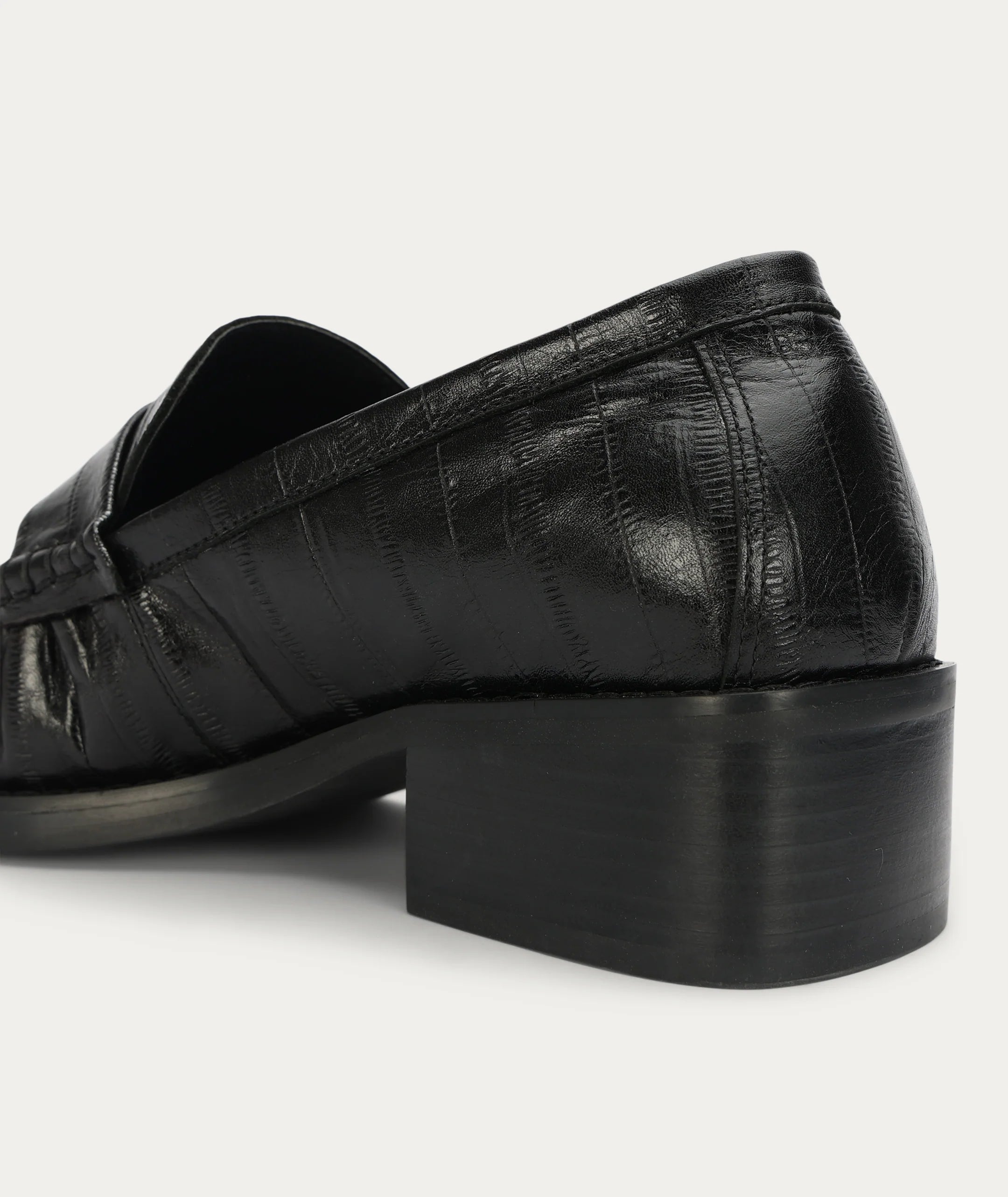 Butterfield Loafer features a tapered square toe and subtle cinching at the front and sides, crafted from Eel-embossed Calf Leather, LWG-certified. Set on a stacked leather heel with a rubber sole, and finished with a padded footbed for all-day comfort.