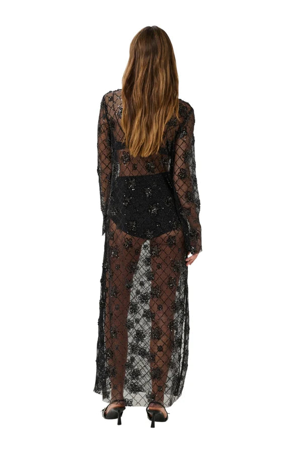 The Brynn Dress features an elegant A-line silhouette with long sleeves, sheer mesh panels, and delicate sequin detailing. Falling to the ankle, it’s a perfect balance of modern glamour and understated sophistication.