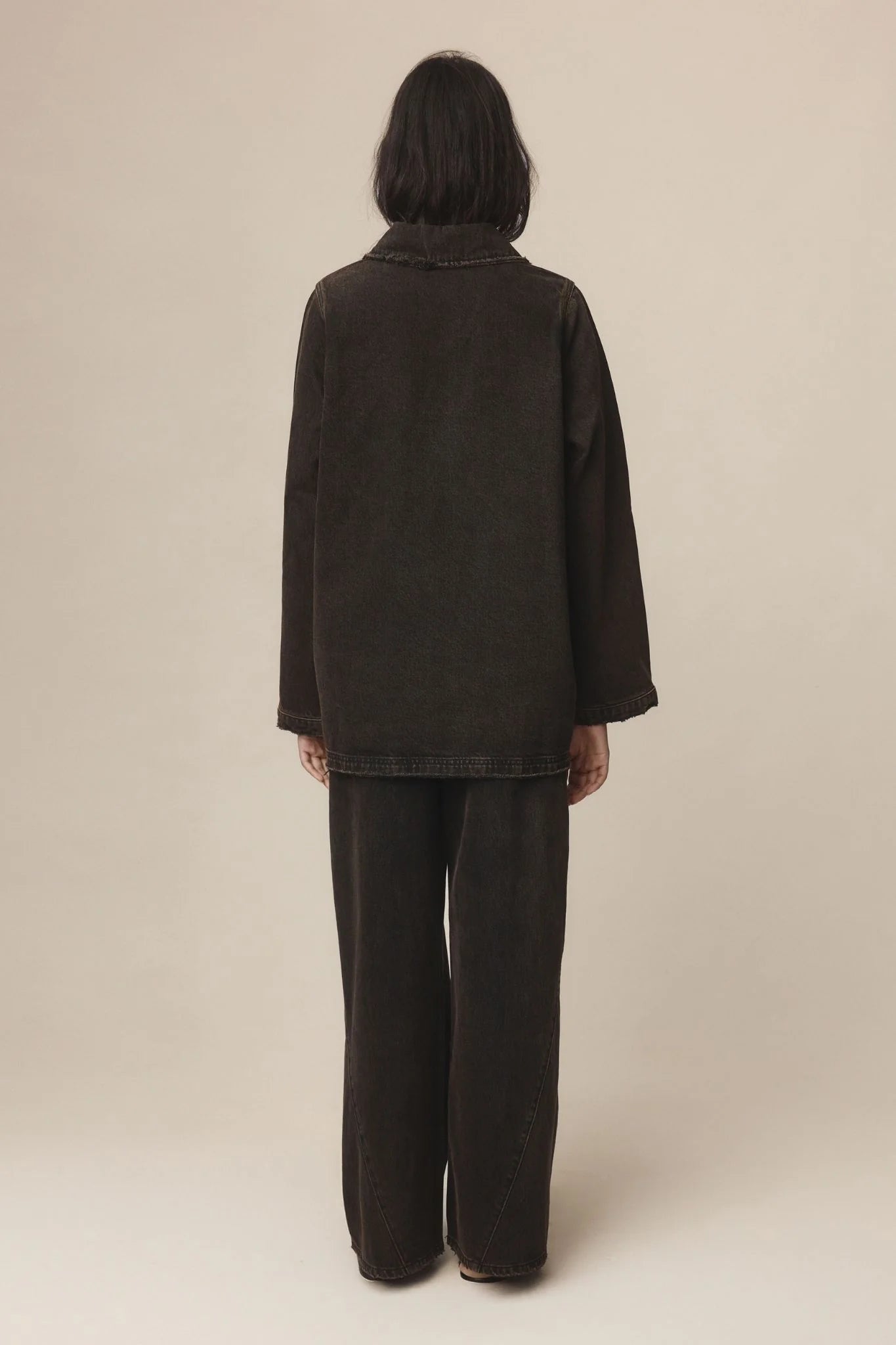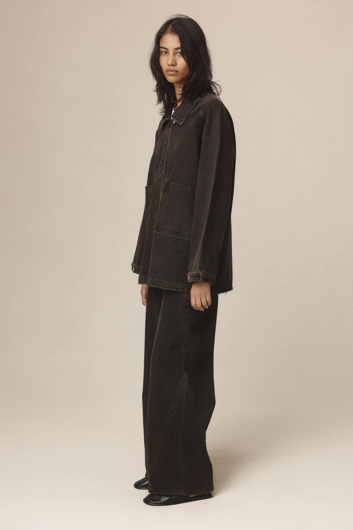 A relaxed and slightly oversized yet versatile denim jacket that layers comfortably. A pointed collar and concealed front placket with snap domes create a streamlined look, while oversized patch pockets are integrated into the front for functionality. Sleeve cuffs are finished with a tab and dome closure to choose if you'd like them loose at the cuff or cinched. Reinforced topstitching throughout enhances durability.