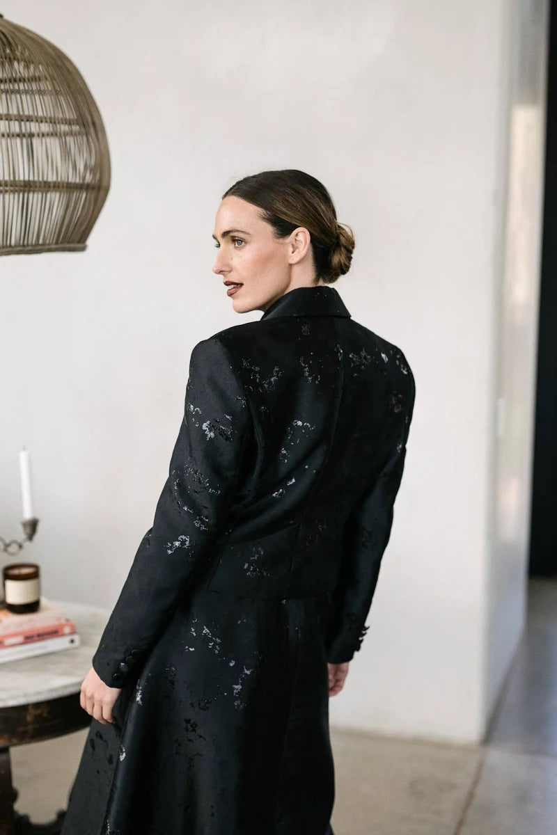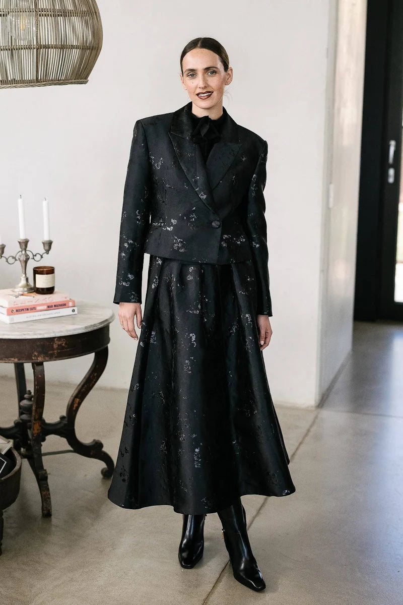 Crafted in a rich black jacquard with subtle texture and shine, the Olé Jacket elevates any outfit instantly. With its clean lines, soft structure and confident silhouette, it’s the kind of piece you throw on and suddenly feel unstoppable. Pair it with the Parted Skirt for a bold, modern evening look that feels effortlessly chic.