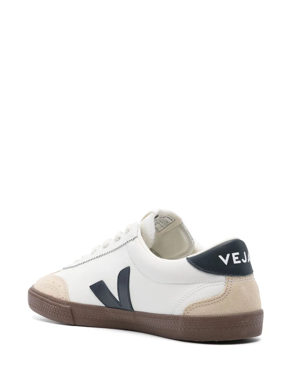 Drawing inspiration from the Brazilian volleyball shoes of the '70s, VEJA's Volley sneakers showcase a streamlined silhouette constructed from leather and suede. This iteration appears in white, with contrasting navy blue and ecru accents.