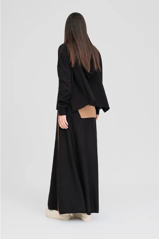 Fabricated in a cotton cashmere blend, the Complacent Skirt is a great full-length, A-line piece. A flattering cut in a soft fabrication with a comfortable waistband makes this piece a fuss-free weekend dressing go-to. A tie waistband with an elastic waist breaks the silhouette for balanced proportion, along with a contrast strip on the side to draw the eye down the body. Pair with an R Tee or shirt, trainers and a slouchy bag for easy and elegant off-duty style.
