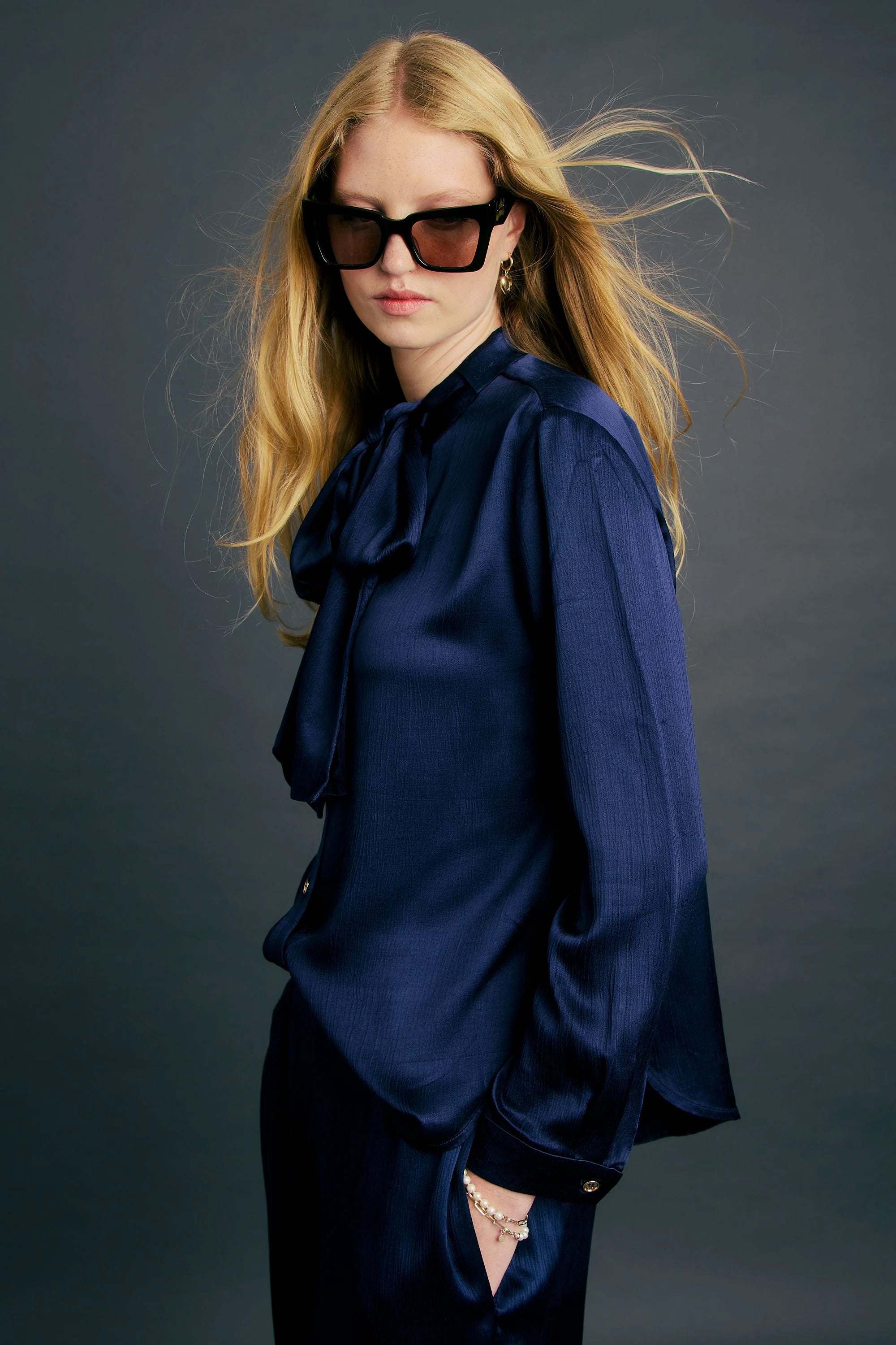 The Deb Shirt reimagines classic shirting through a lens of fluidity and elegance. Crafted from crinkle satin, the fabric’s subtle sheen and airy drape soften the tailored lines of this button-through style. A statement bow at the neckline elevates the silhouette with soft, feminine structure. Sharp yet relaxed; it’s equally polished with trousers in the office or paired with denim for understated evening wear.