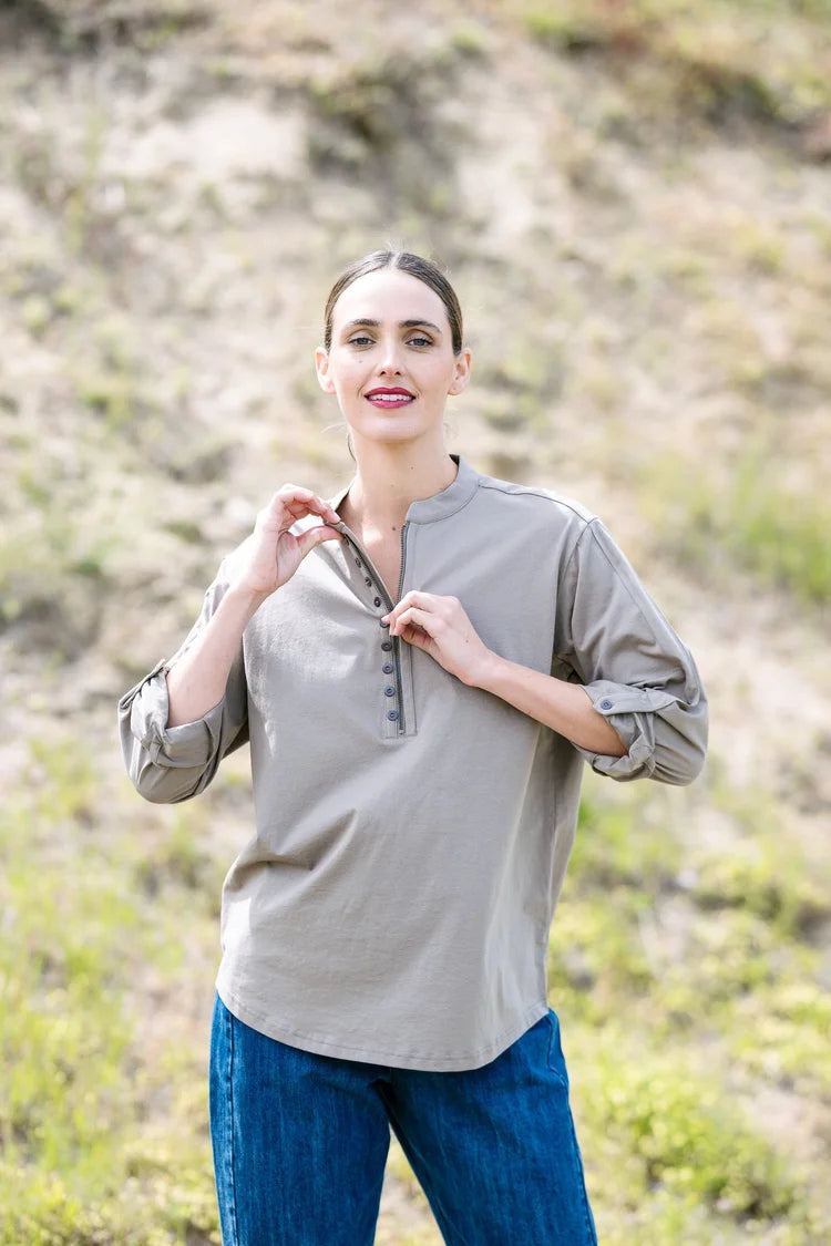 Drills by M.A. Dainty is a comfortable, relaxed, long sleeve, soft cotton shirt top in a warm green. Features a Mandarin style stand collar, a detailed front with faux buttons, red stitching and zip opening for easy wear, long sleeves with a single button cuff, a buttoned strap for rolling up the sleeves and an even hemline A great layering mid season top that can be paired with the trucker jeans for an elevated style.