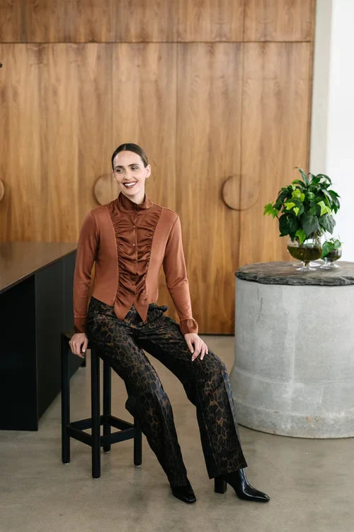 The M A Dainty Freya Top in Tan is crafted in a warm tan hue. It features a structured, tailored fit with delicate front ruching that adds texture and a feminine detail.