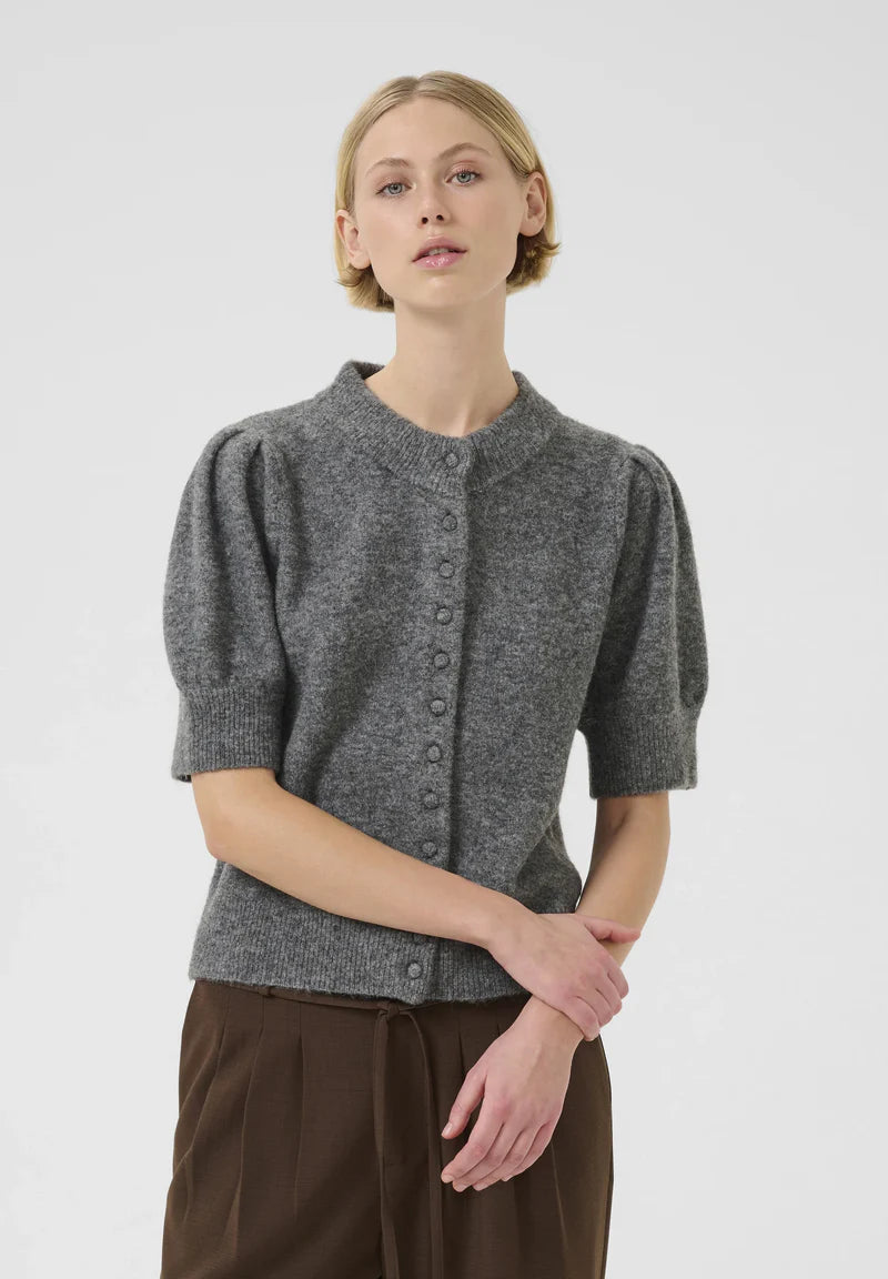 This short-sleeve cardigan features a soft knit construction with a feminine silhouette and relaxed structure. Designed with a round neckline and button-front closure, it falls to a flattering hip length with half sleeves for easy layering. Crafted from a comfortable blend of acrylic, polyester, wool and elastane, it offers warmth, stretch and everyday versatility, working well styled casually or for a more refined look.