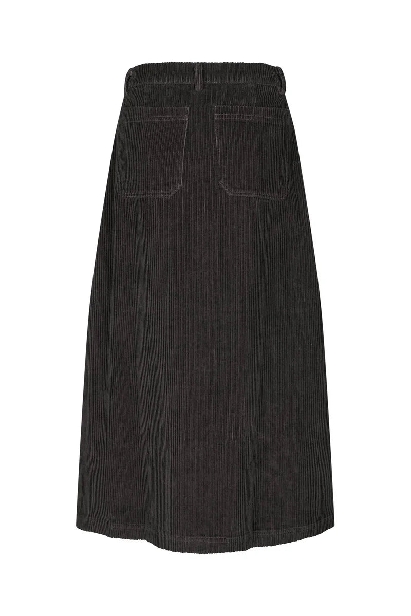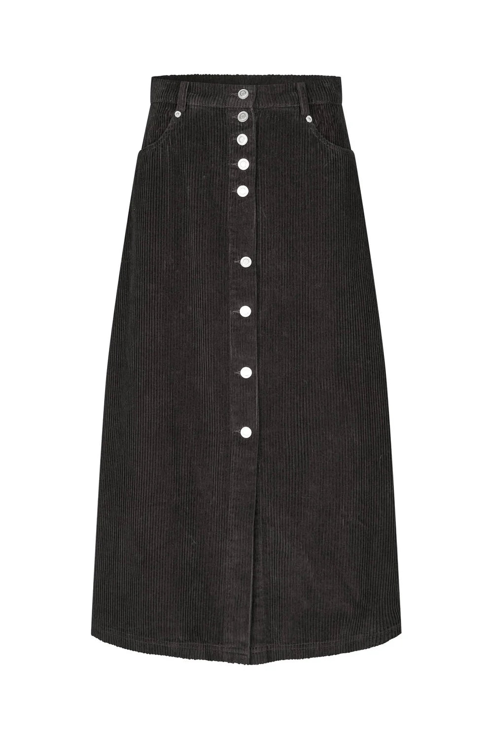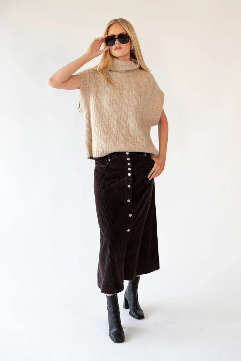 Una Maxi Skirt in Mocha is a flattering A-line skirt made from heavy corduroy with snap buttons all the way down the front and a small slit at the bottom that adds movement and edge. It features a regular waist, belt loops, and both side and large back pockets for a laid-back vibe.