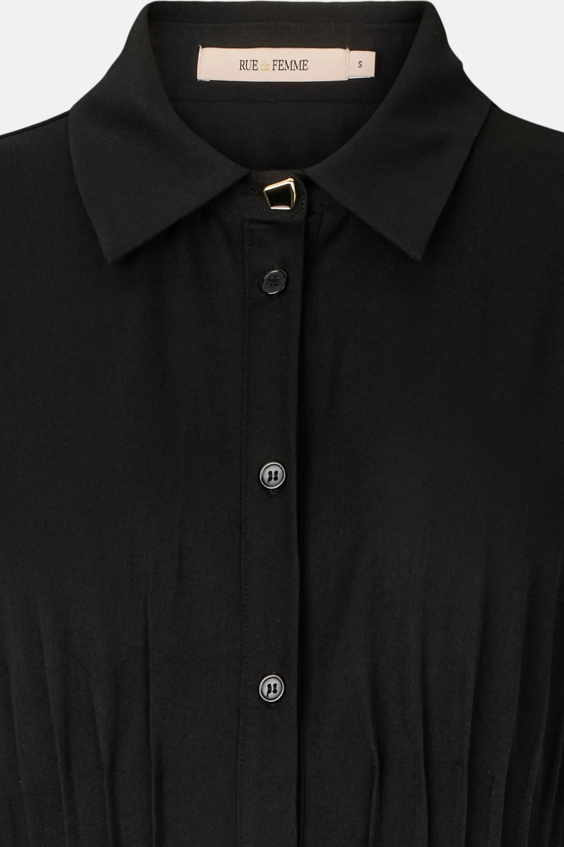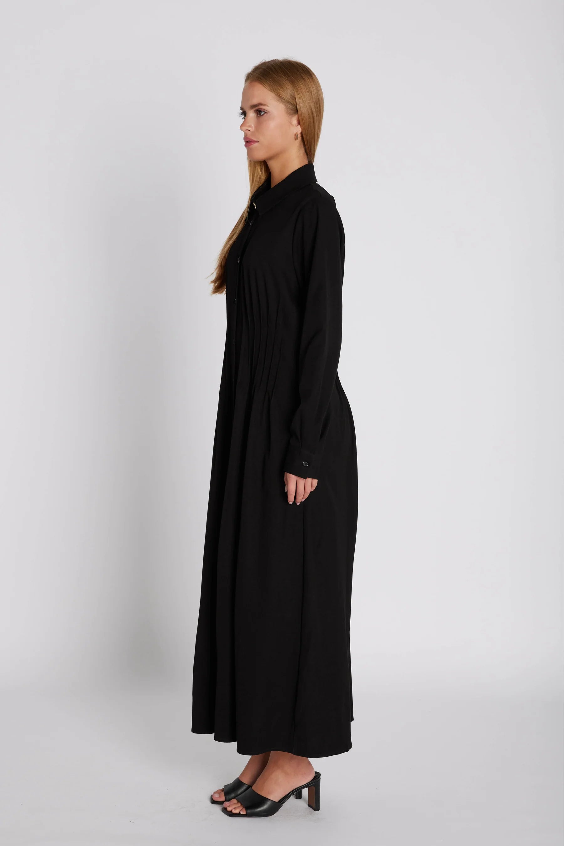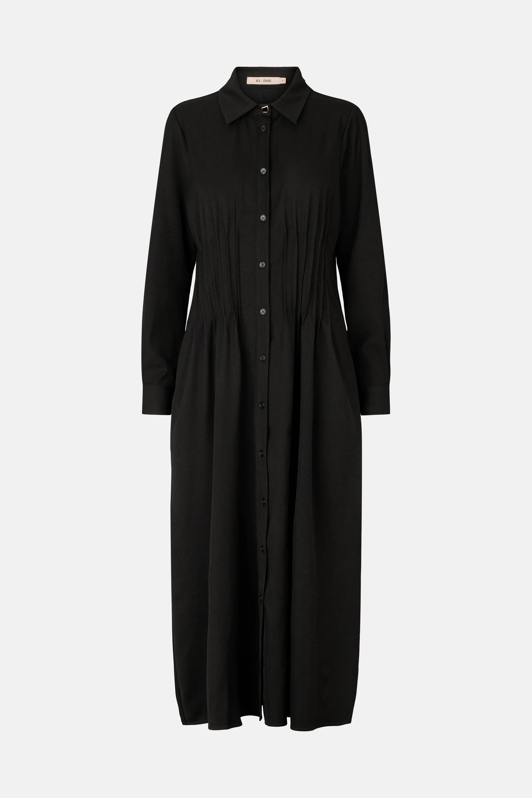 Lumina is a shirt dress with long sleeves, a classic collar and decorative button closure at the front. Notches and pleats at the waist create a feminine and defined silhouette.