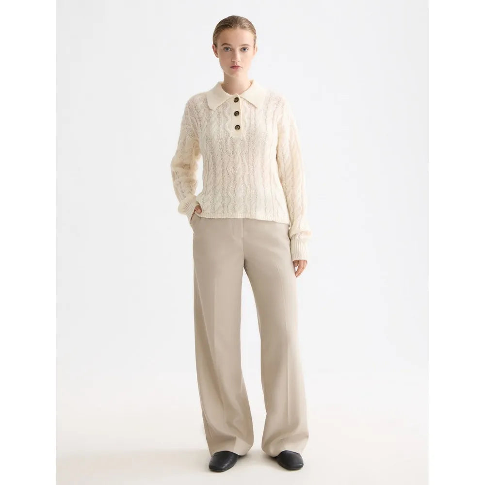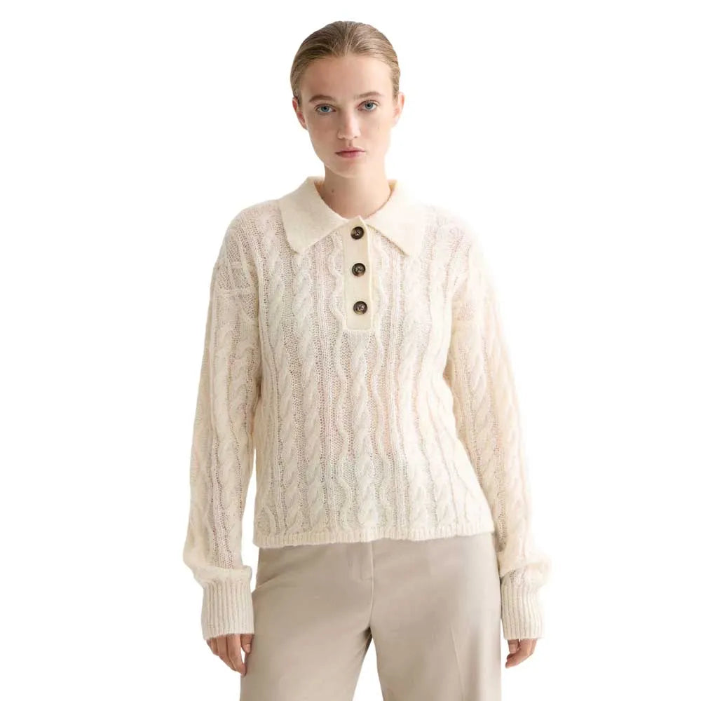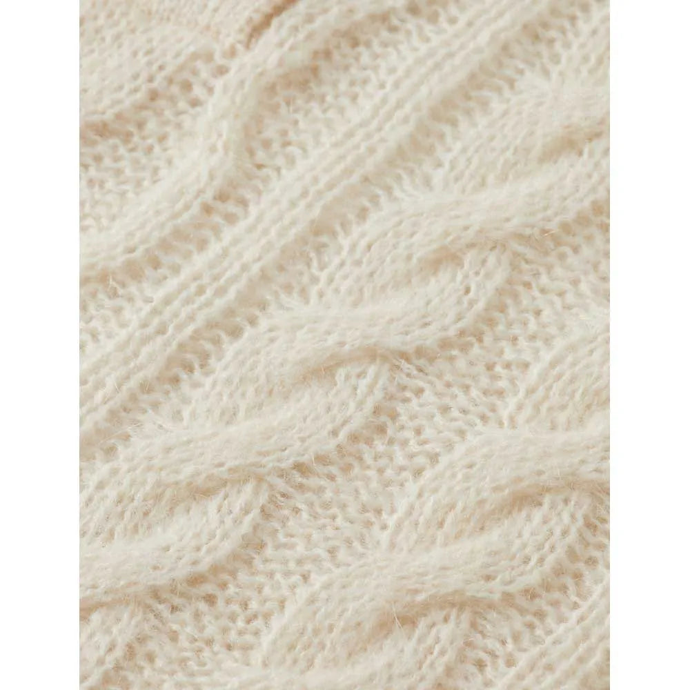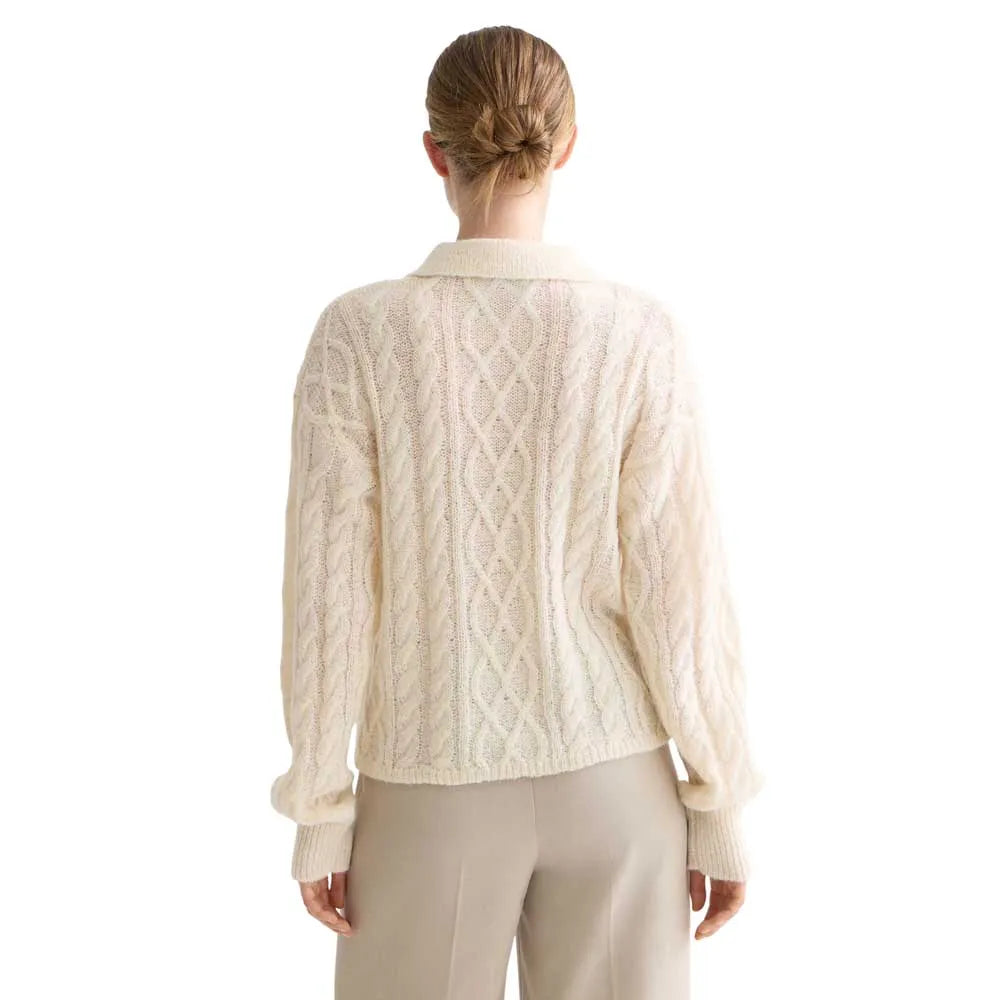 A warm polo neck pullover with classic cable stitching - timeless detail in a soft, modern knit.
