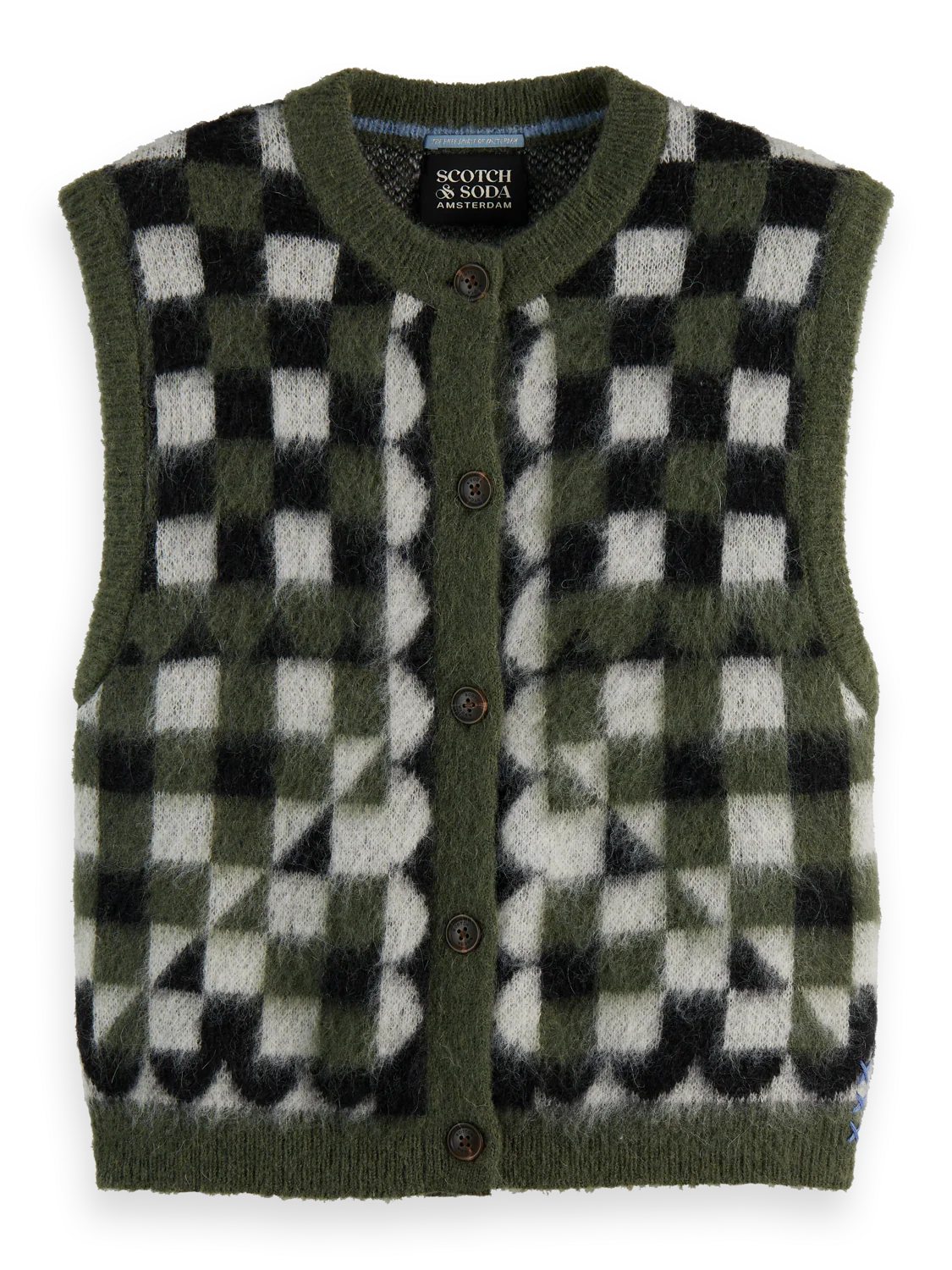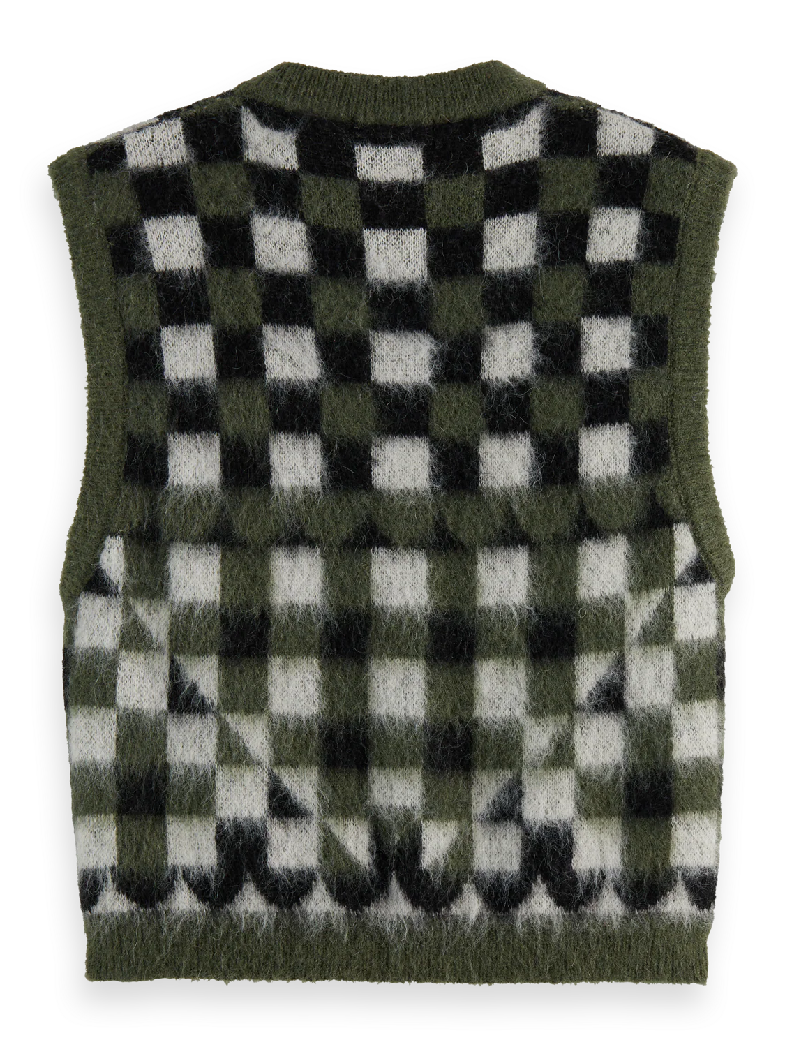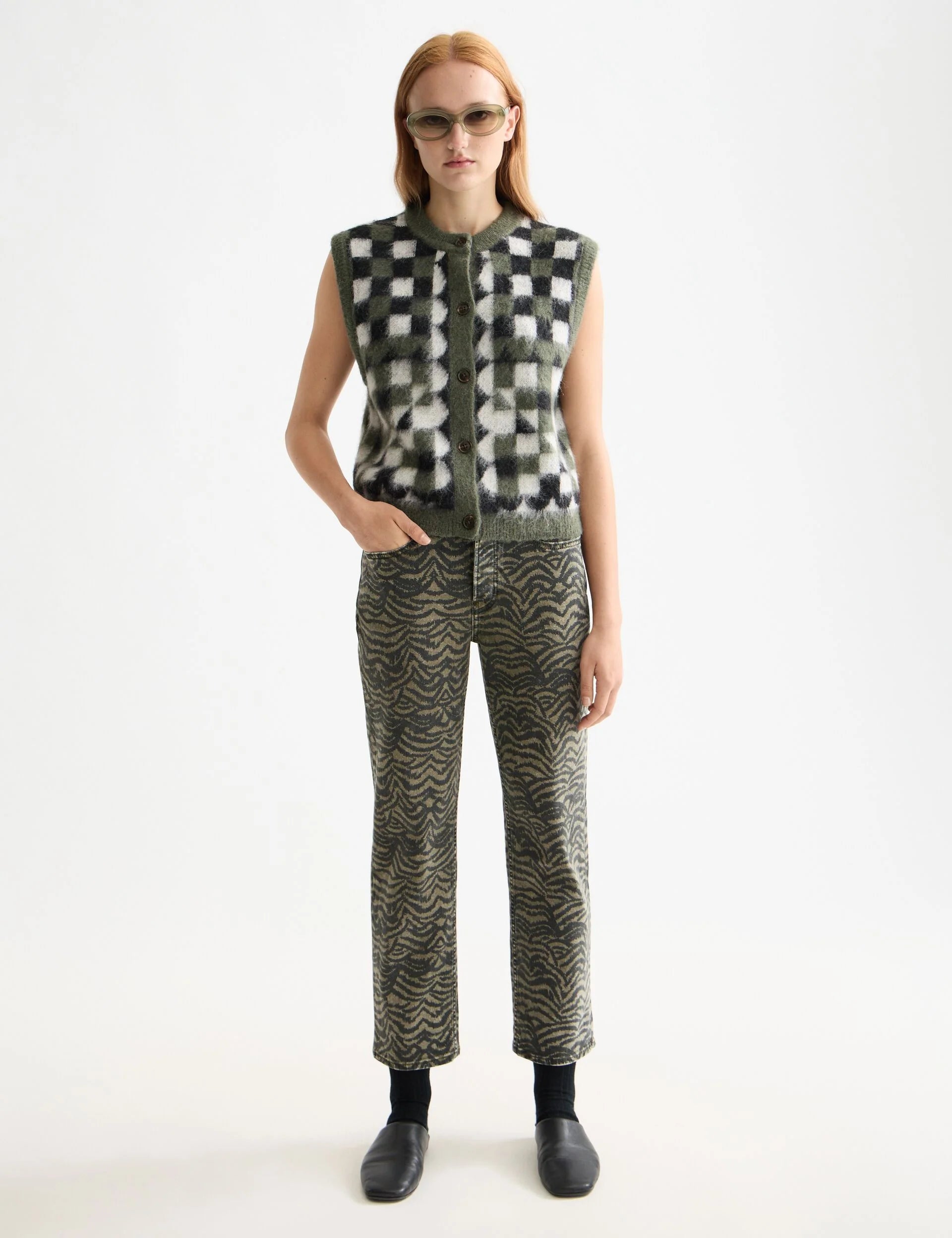 This sleeveless spencer is crafted from fuzzy jacquard knit, perfect for playful layering with a bold texture.